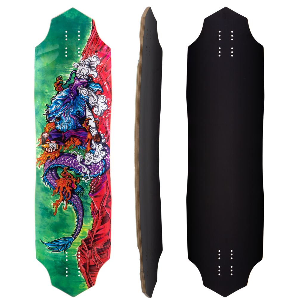 The Sho Stopper downhill longboard deck, is the design of team rider Sho Oullette. It is a 9-ply speed stiff symmetrical board with medium rocker and cliff sharp rails.
